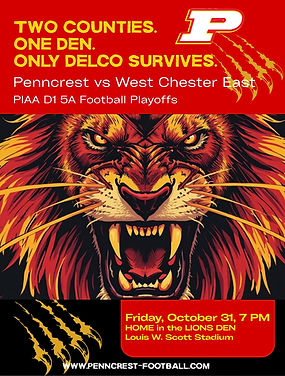 For the first time in Penncrest Football history, the Lions will host a first-round playoff football game at HOME in the Lions Den at Louis W. Scott Stadium. On Friday, October 31st at 7 PM - Halloween - #8 Penncrest will take on the #9 West Chester East Vikings in the PIAA D1 5A playoffs. #LIONSDENOFDOOM